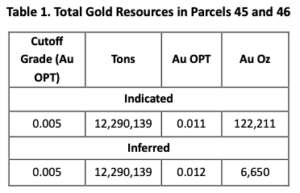 Based on the National Instrument 43-101 – Standards of Disclosure for Mineral Projects (“NI 43-101”) Technical Report titled “Amended Technical Report on the Cahuilla Project Gold and Silver Resources, Imperial County, California” dated March 10, 2021, authored by Steven D Craig, C.P.G., et al., on the Cahuilla Gold Project, Parcels 45 and 46 comprise approximately 12,290,139 tonnes containing an aggregate of 122,211 ounces of indicated gold resources, and 6,650 ounces of inferred gold resources at a 0.005 oz/ton cutoff grade (Table 1).